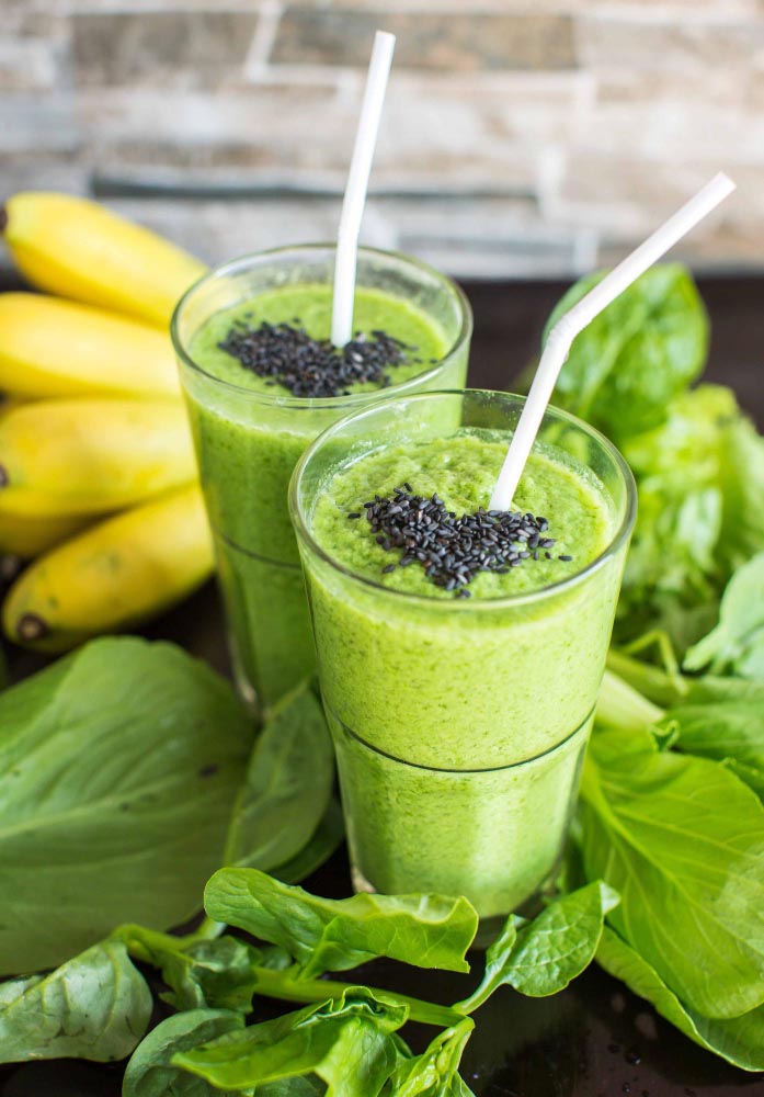 - Smoothie vert énergisant : épinard, banane, pomme et lait végétal.